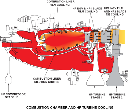 HP stage 10 air is bled through exits in the inner wall of the annulus between the stage 10 rotor blades and the outlet guide vanes (OGV). This air is routed around the HP compressor shaft and cools the front face of the HP turbine stage 1 disc. Another source of HP10 air bleeds off after the compressor outlet diffuser and flows around the combustion liner. Some of this air then cools the nozzle guide vanes and joins the exhaust gas flow. The remainder flows through preswirl nozzles that control the level of the cooling airflow. The preswirl nozzles direct the air at the optimum angle to enter the HP1 turbine blade roots.