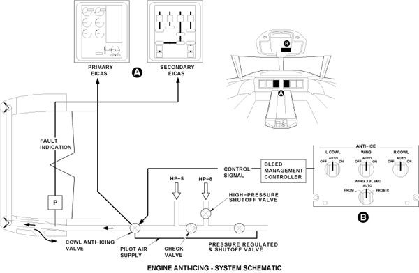 The ANTI-ICE control panel (a part of the bleed-air control panel) in the overhead control panel of the flight compartment has four three–position rotary switches. Two of these are for the engine intake cowls. These switches energize or remove the electrical power from the solenoid of the cowl anti-icing valve. This is to supply or to stop stage 5 air to the piccolo tube.