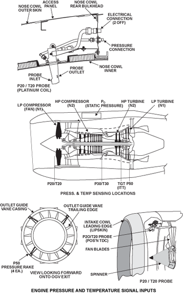 The P20/T20 probe is located at the 12 o’clock position in the engine inlet duct. The total pressure and total temperature at the engine inlet are sampled upstream and forward of the LP (N1) fan in the inlet duct.