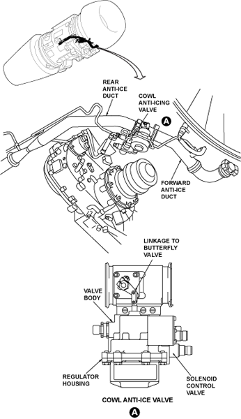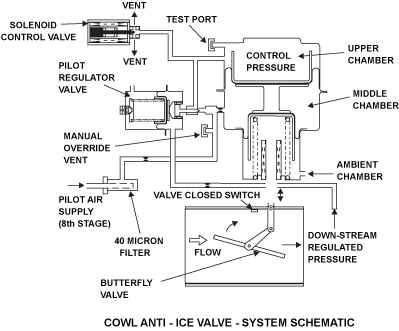 The cowl anti-icing valve has a solenoid, a butterfly valve, and a pilot regulator valve. When there is no electrical power to the solenoid and no pressure in the duct, the butterfly valve stays open because of spring force. This lets the hot air go through to the piccolo tube in the leading edge of the intake cowl. If the downstream pressure increases, the pilot regulator valve (a needle valve) opens to cause higher pressure in the upper chamber. The butterfly valve starts to close and decreases the air flow to the intake cowl. When the solenoid is energized and the duct pressure is above 8 psi (55.2 kPa), the cowl anti-icing valve closes the butterfly valve (which stops the hot air to the piccolo tube).