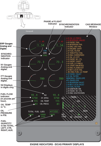 The engine indicating system shows the different engine system functions as analogue and digital displays on screens in the flight compartment. Each indication shows a different engine function, as measured by its related system. The systems have sensors which monitor the condition of the engine and supply performance data to the engine electronic controller (EEC). The EEC uses this data to control the engine and send performance indications to the displays in the flight compartment.