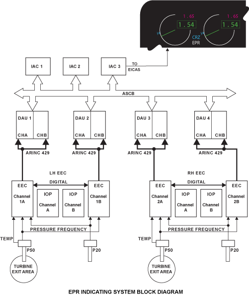 The power indicating system gives continuous indications of the engine power and the compressor speeds on the primary page of the engine indicating and crew alerting system (EICAS). The power output is shown as engine pressure ratio (EPR) and the compressor speeds are shown as N1 (digital and analog) and N2 (digital) percent rpm.
