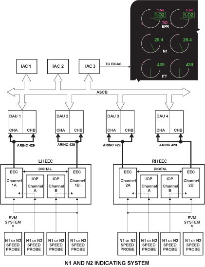 An intermediate connector on the engine allows easy changeover of speed probe destinations, so that they can be reconfigured if one fails. N1 and N2 speeds are indicated on EICAS as percentages and are primary engine parameters.