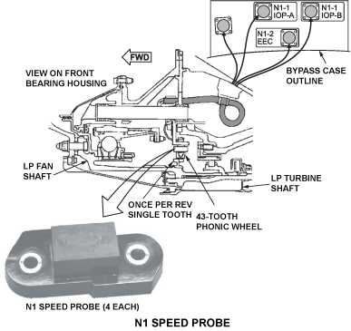 The speed sensor is an electro magnetic sensor that produces an electromotive force when in close proximity to a rotating toothed ferrous (phonic) wheel. The sensor produces a positive and negative pulse for each tooth on the wheel. These pulses are then interrogated by the EEC to determine the N1 shaft speed.