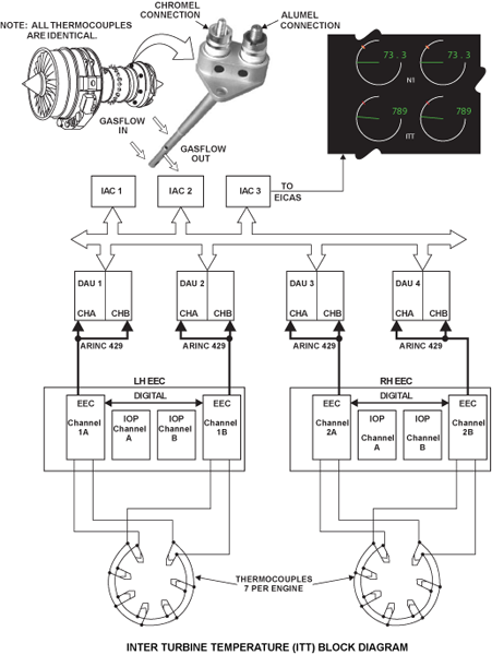EEC processing of the signal involves converting the analog voltage received from the thermocouple harness to a digital value, taking into account the EEC reference temperature (CJT) and the value of ITT trim provided by the Data Entry Plug. The latter ensures that all engines for a particular rating and application have the same ITT redline.