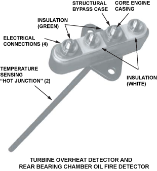 The RBC oil fire detection system monitors the temperature of the rear bearing chamber HP4 sealing air. The air is sampled from beneath the rear heat shield of the rear bearing chamber support structure, using a pair of thermocouples, which are housed in a single unit. The unit is located in an LP turbine nozzle guide vane (NGV) at the 4 o’clock position, with the engine viewed from the rear. At the outer position, the thermocouple assembly has a terminal block which attaches to the turbine case with two bolts. An electrical harness connects the terminal block to the two channels of the EEC. At the inner position, the thermocouple assembly is adjacent to the rear bearing chamber.