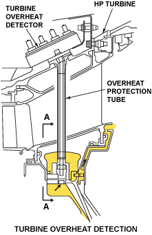 The turbine overheat detection system monitors the turbine cooling airflow (HP6), using a pair of thermocouples. The air sampled is the HP6 cooling flow acting on the rear face of the HP stage 2 turbine disc.