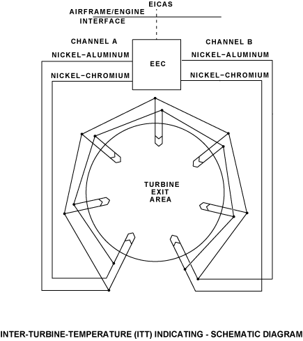 The overall turbine temperature is critical to the health of an operating engine and forms the basis for the redline limit. A convenient place to measure the temperature that would be representative of the overall temperature of the turbine, is between the LP and the HP turbines. This temperature is called the Inter-turbine Temperature (ITT) and is used by the EEC during the entire engine start and operating range to control the engine and to relay it to the flight deck as a primary engine parameter.