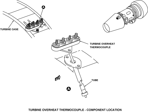The two thermocouples are housed in a single unit. The unit is located in the LP1 turbine nozzle guide vane (NGV) at the 1 o’clock position of the engine, viewed from the rear. At the outer position, the thermocouple assembly has a terminal block which attaches to the turbine case with two bolts. An electrical harness connects the terminal block to the two channels of the EEC. At the inner position, the thermocouple assembly is adjacent to the rear-bearing chamber support-strut.