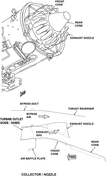The function of the collector/nozzle is to mix the turbine exhaust with the bypass air. The cone assembly gives a smooth flow from the turbine and controls the mixer area.
