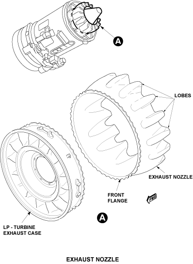 The exhaust nozzle is a cylindrical shape with open ends. It has a flange around the forward edge and lobes around the circumference which decrease in depth to the forward edge. This flange attaches to the rear of the low pressure (LP) turbine exhaust case with bolts.