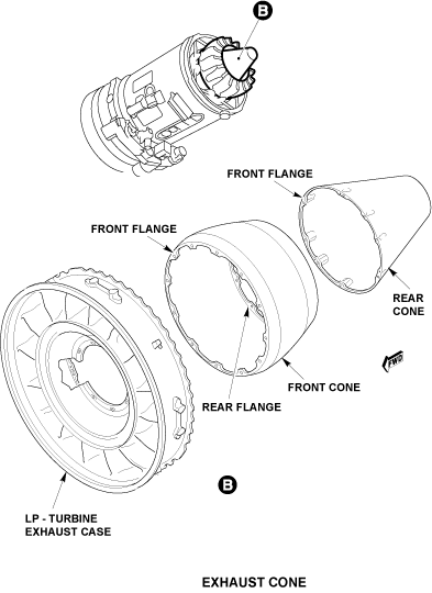 The front cone is a cylindrical structure with a flange at the forward and rear edges. The forward flange has bolt holes and the rear flange has captive nuts. The forward flange attaches to the rear of the LP turbine exhaust case with bolts.