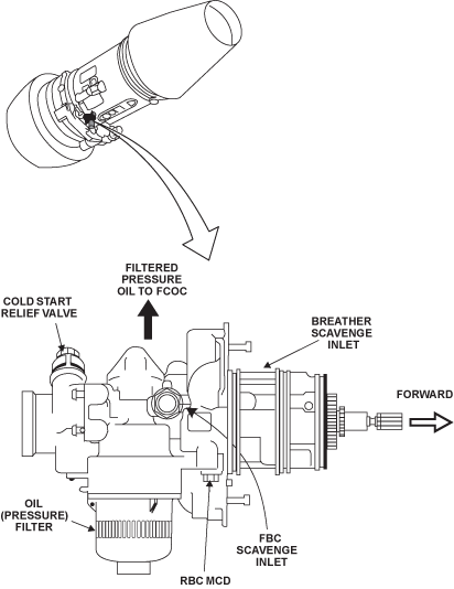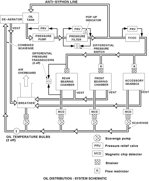 The oil distribution system is a full-flow recirculating type which is divided into a supply part and a scavenge part. The supply part includes a pressure pump which moves the oil through a pressure filter to the primary areas for lubrication. Pressurized oil is supplied to the front bearing chamber, the rear bearing chamber and the accessory gearbox. As the bearings and gears are lubricated, the oil collects in the primary areas. The oil is removed from these areas by scavenge pumps which send it back to the oil tank. There are magnetic chip detectors (MCDs) in the scavenge lines to monitor the internal condition of engine components.