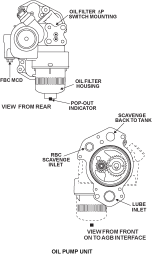 The oil pump unit (OPU) supplies pressure to move the oil through the pressure lines to the drive gear and bearings, scavenges the oil as it flows out of these components and returns it, along with any foam (or trapped air) to the oil tank. The pump is installed on the rear face of the accessory gearbox (AGB).