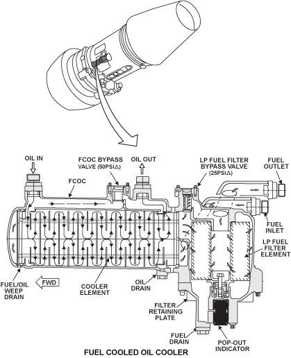 The FCOC has two bypass valves. One is an oil pressure-relief bypass valve for the core, set at 50 psid, and the other is a fuel filter bypass valve, set at 25 psid. The oil pressure-relief valve lets the oil bypass the fuel-cooled oil cooler during cold engine starts. The fuel filter bypass lets the fuel bypass the low pressure filter when it is clogged. An antisiphon hole is located between the oil inlet and outlet ports to prevent the oil from migrating after engine shutdown. A weep drain gives indication of a real failure between the fuel and the oil system.