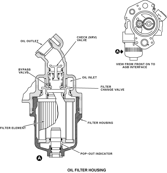 The oil filter pop-up indicator can only be reset when you remove the filter. It is not necessary to drain the assembly before removal of the filter. As the lower housing, and thus the element, are removed, a valve closes to prevent the leakage of oil. An oil filter differential-pressure switch also attaches to the oil pump unit. This gives a warning in the flight compartment when unwanted material starts to cause a blockage of the filter. The pressure switch senses filter inlet and outlet oil pressure and operates at a differential pressure of 18 psi (124.11 kPa).