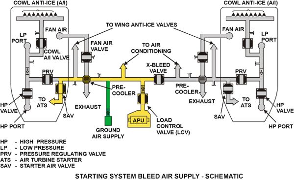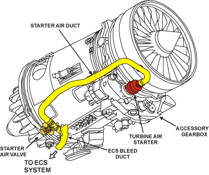 The engine starting system uses high pressure air to supply the power which turns the engine. This air source can be the ground supply, the auxiliary power unit (APU) or the adjacent engine which operates. The high pressure air is supplied through airframe/engine environmental control system (ECS) ducts to the starter air valve. When this valve opens, the air goes through a starter air duct to the air turbine starter. As the starter turns, the movement is transmitted through a gear train and clutch mechanism to an output shaft. The output shaft engages with the accessory gearbox radial drive shaft to turn the HP compressor rotor.
