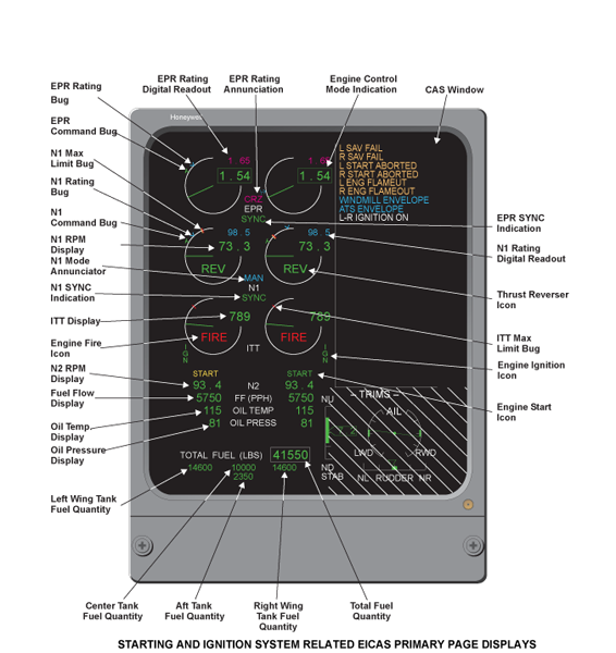 Cockpit displays of the system consist of a white ON light on the IGNITION PBA and several EICAS primary page indications such as EPR, N1, ITT, and N2, as well as two "icons" below the ITT gauges reading IGNITION and START.