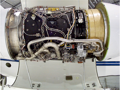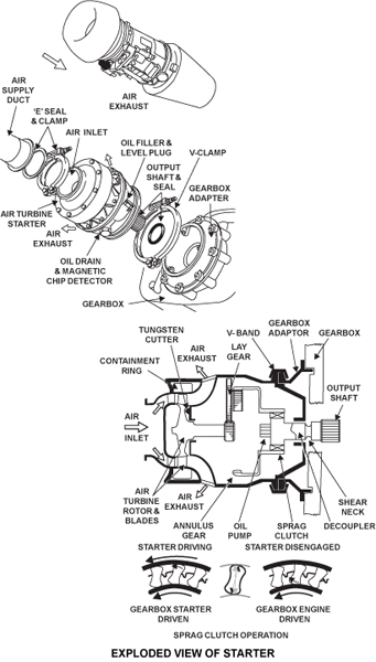 The starter is a pneumatically-operated turbine unit. The starter motor drives the HP Compressor shaft assembly via the starter drive gear in the AGB, to enable engine starts. The starter mounting adapter is doweled and bolted to the accessory gearbox front face.