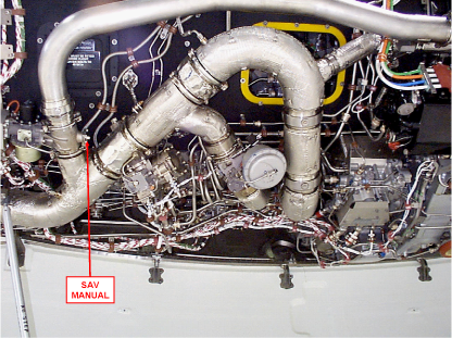 Protective gloves should be worn to avoid injury when working on the SAV/STARTER ducts. If the SAV is to be manually opened in order to dispatch the airplane with a faulty SAV, starter exhaust air of up to 200 °C will exit overboard via the open SAV access panel on the lower cowl.