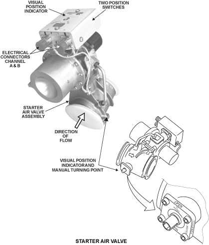 The starter air valve is a butterfly-type shutoff valve which operates pneumatically. It controls the flow of air to the air turbine starter. The valve is near the bottom rear of the engine between the starter air duct and the cabin air duct. When you set the start sequence on the ENGINE control panel in the flight compartment, the engine electronic controller (EEC) causes the valve to open. The starter air valve includes the components that follow: