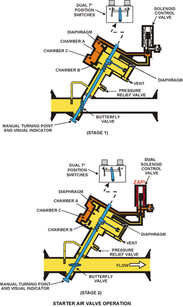 When either solenoid is energized by an input from one of the two EEC channels, air is ported to chambers A and B. Chamber C is now vented to atmosphere via the adjustable vent. Pressure in chamber B now overcomes the torsion spring load to force the piston to open the butterfly valve allowing air flow to the starter motor. Chamber C venting is controlled by the vent to a preset opening rate of the valve. This controlled vent rate prevents shock loading of the starter motor.