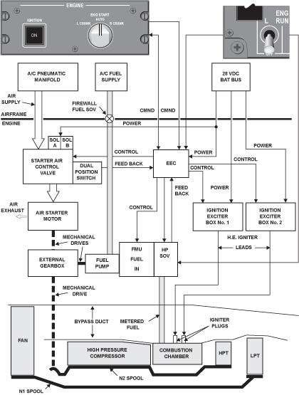 The BRR 710 engine is started by means of a pneumatic starter and a dual high energy electrical ignition system. Starting and motoring cycles are initiated from controls in the flight deck and routed through the FADEC, which uses the EEC as its main component to provide the following services as needed: