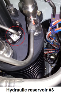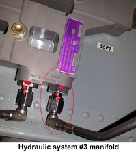 - Locate and cap the Hydraulic Reservoir Bootstrap pressure line associated with the overheating system to prevent hydraulic pressure supply to the bootstrap (see line circled in images below). Run the hydraulic system. Is the Hydraulic system still overheating?