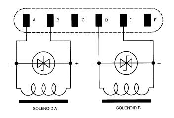 -Solenoid A (pins A-B) is gear up or retract.-Solenoid B (pins D-E) is gear down or extend.