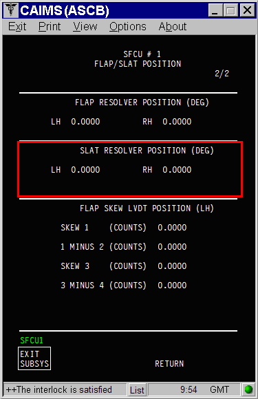 - Monitor the slats resolvers in CAIMS and confirm that the left and right resolvers on both SFCUs are reporting the same position.
