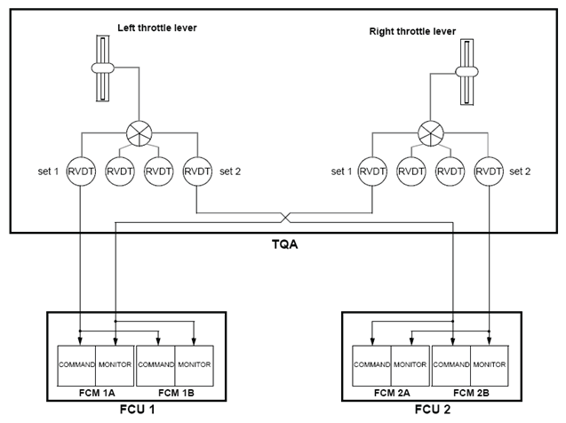 Each FCU is associated with one set of left and right throttles RVDTs. Left throttle RVDT is received in COM and right in MON.