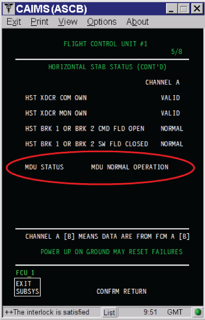 NOTE 1: The present MDU-5 is known to be susceptible to nuisance coasting if there is a fast trim cycle of NOSE-UP or NOSE-DOWN. To prevent unnecessary troubleshooting and component removal after an occurrence of this phenomenon, it is recommended to do Flight Control Systems reset procedure before the next flight to determine if the STAB CH1 FAIL or STAB CH2 FAIL advisory or STAB TRIM caution message shows. If one of these messages still show after the self-test, it is necessary to do troubleshooting. If during subsequent flights a STAB CH1 FAIL or STAB CH2 FAIL message shows more than once in 10 flight legs, we suggest that operators record the CAIMS flight fault history for FCU 1 and FCU 2 if the faults reported are: