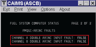 - Using CAIMS - FUEL SYSTEM STATUS Page, determine if the double ARINC input failure is between DAU1 and FMQGC CH A, or DAU2 and the FMQGC CH B.