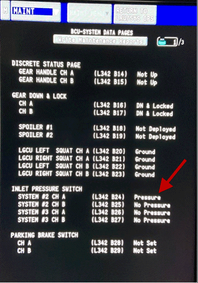 - Pressurize hydraulic system 3 and the INLET PRESSURE SWITCH for SYSTEM 3 CH A and CH B should show PRESSURE.