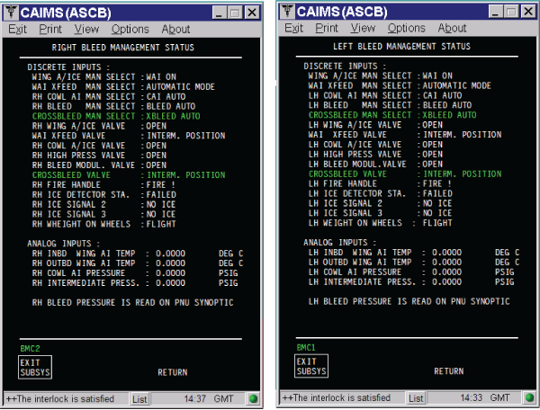 - In CAIMS, go to "SYSTEM DIAG", Chap. 36, BMC1, "LRU TEST" and on Discrete & Analog input data page, check position of Cross Bleed Valve.