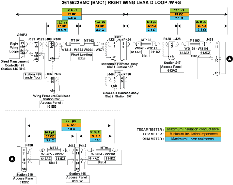 - Perform wiring checks of the remaining wires linking the Right WING A/ICE Loops circuit to BMC 1.