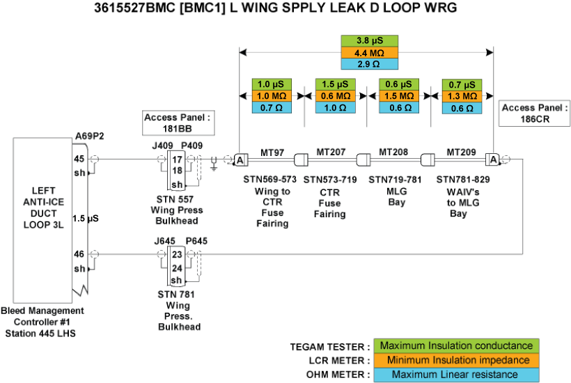 - Perform wiring checks of the remaining wires linking the Left A/ICE DUCT Loops circuit to BMC 1.