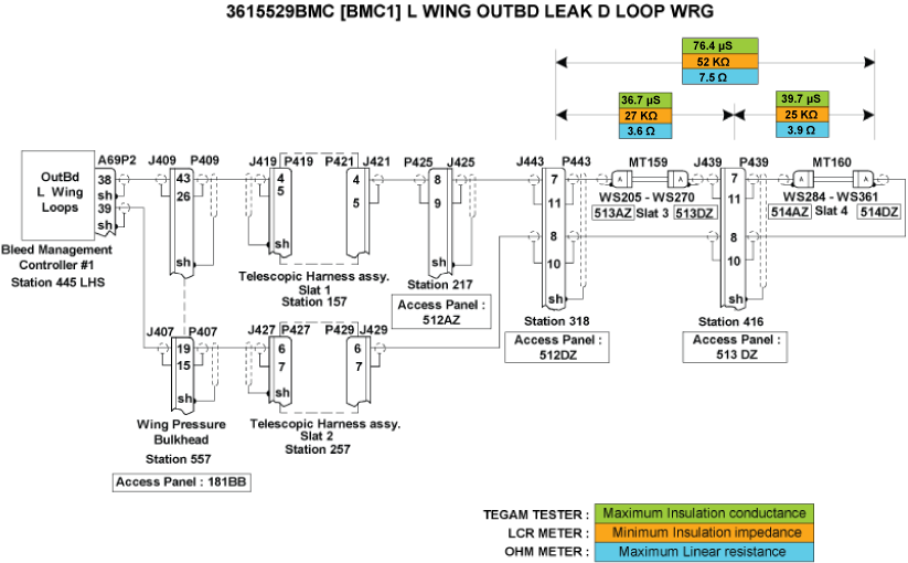 - Perform wiring checks of the remaining wires linking the Left WING OUTBOARD Loops circuit to BMC 1.