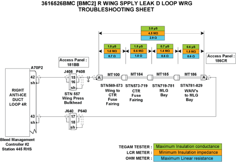 - Perform wiring checks of the remaining wires linking the Right A/ICE DUCT Loops circuit to BMC2.