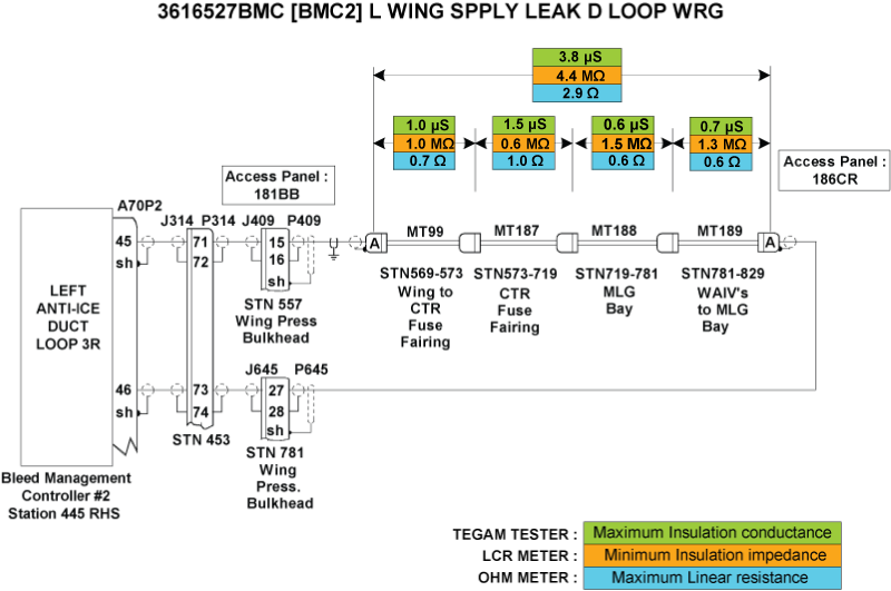 - Perform wiring checks of the remaining wires linking the Left A/ICE DUCT Loops circuit to BMC2.