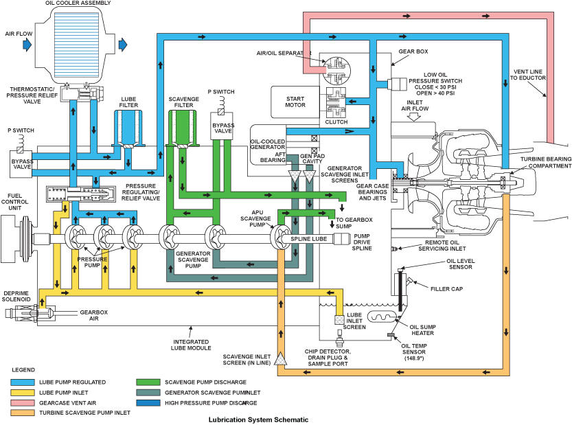 The oil from the APU gearbox keeps the generator cool. The oil flows through APU generator and gearbox to the center of the rotor shaft and out through jets as a spray. The oil keeps the coils and diodes cool and it also lubricates the bearings of the APU generator. The oil falls from the coils and collects in two sumps installed at each end of the generator. The oil is sent back to the APU gearbox, through the cooling and filtration system, by an external scavenge pump.