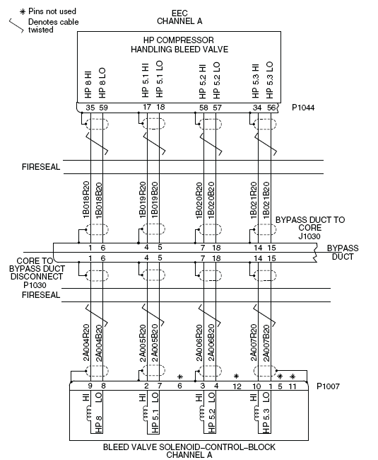 - Perform wiring checks between the EEC connector P1044, bypass duct connector J1030 and the BVSB connector P1007.