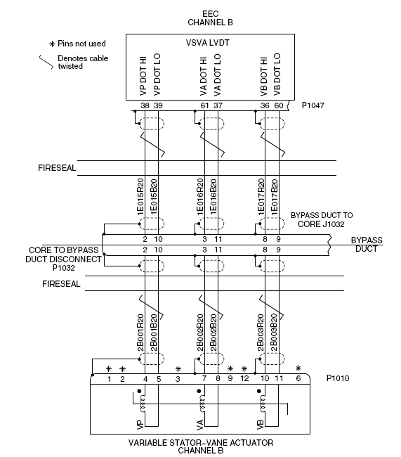 - Perform wiring check between EEC 1 (P1047), the bypass duct (J1032) and the VSVA (P1010).