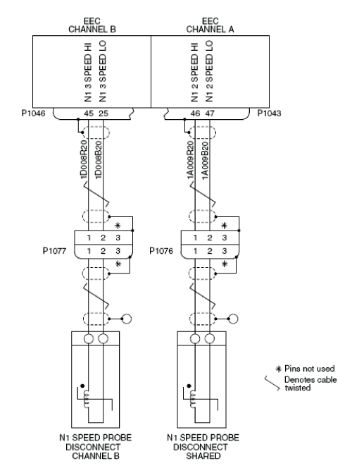 - Perform wiring checks between N1 Speed Probe (P1077) and EEC (P1046).