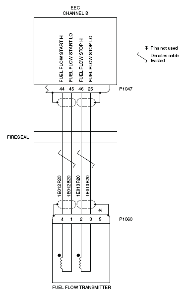 - Perform wiring checks between fuel flow transmitter connector (P1060) and EEC connector (P1047).