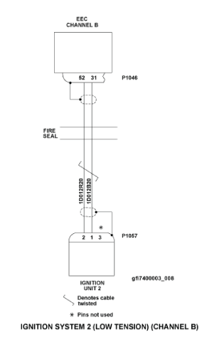 - Disconnect the EEC connector (P1046) and the ignition unit 2 connector (P1057). Perform a visual inspection of the associated wiring and EEC connector (P1046) and ignition unit 2 connector (P1057).