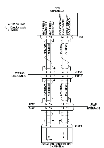 - Perform a check of the insulation resistance of the interface connectors ICU (L43P1), Bypass Disconnect (P1116) and Left EEC (P1043).