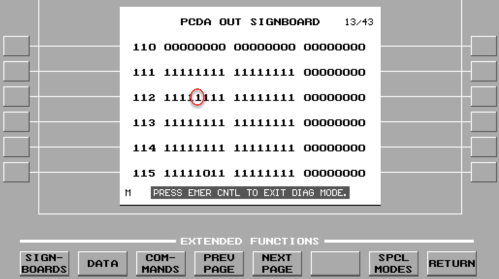 - Gain access the EMS CDU Signboard Menu. Select PCDA out, Labels 111 and 112. Verify that Built-In Test (BIT) 29 of Label 111 is not set to "0" (seat belt switch to AUTO) and that Built-In Test (BIT) 25 of Label 112 is not set to "0" (seat belt switch "ON").