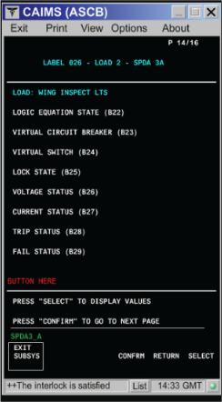 - Using the PMAT, access CAIMS, SYSTEM DIAGNOSTICS, ATA 24, SPDA 3A, LRU TEST. Select SPDA LOAD STATUS LABEL 020-027 and advance to page 14 of 16. Use the table below to check the status: