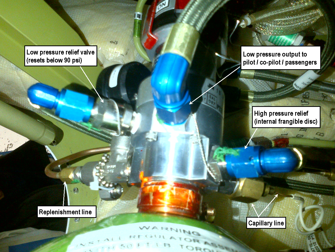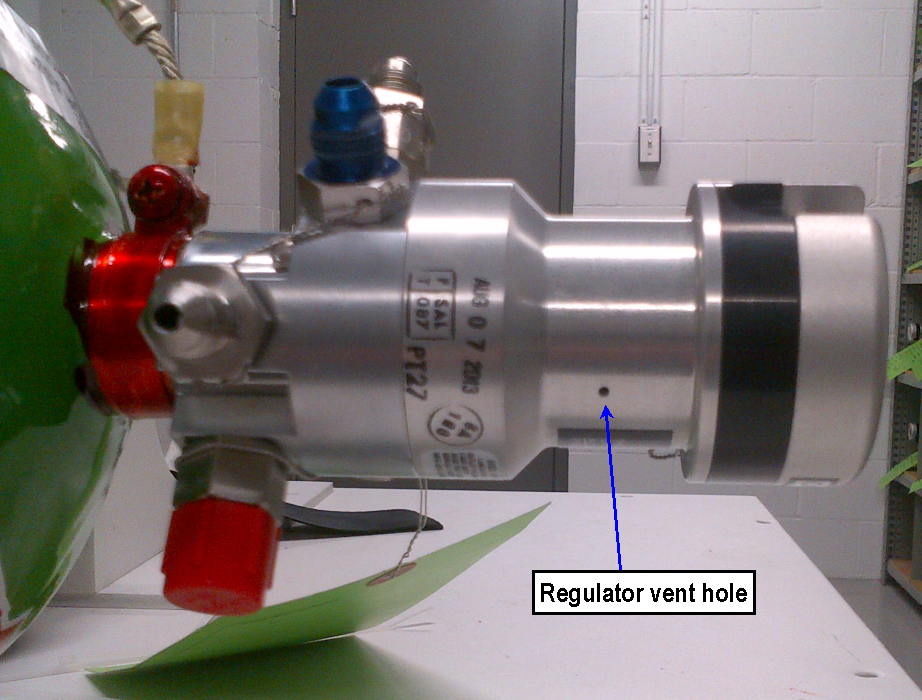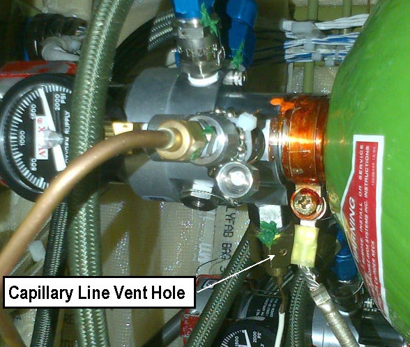 - Open the oxygen cylinder regulator on both right side oxygen cylinders. Use leak detection compound and saturate the vent hole on the oxygen bottle regulators one at a time and watch for bubbles. A mirror is required to see the vent holes. The High Pressure Capillary line, due to the small diameter can be damaged with a small force. Work carefully around the line.